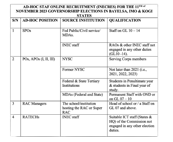 All applicants are encouraged to fill and submit the registration forms online to be eligible for consideration as ad-hoc staff in the 11th November, 2023 off-cycle governorship elections in Bayelsa, Imo and Kogi states. For Eligibility criteria, please see the tables below