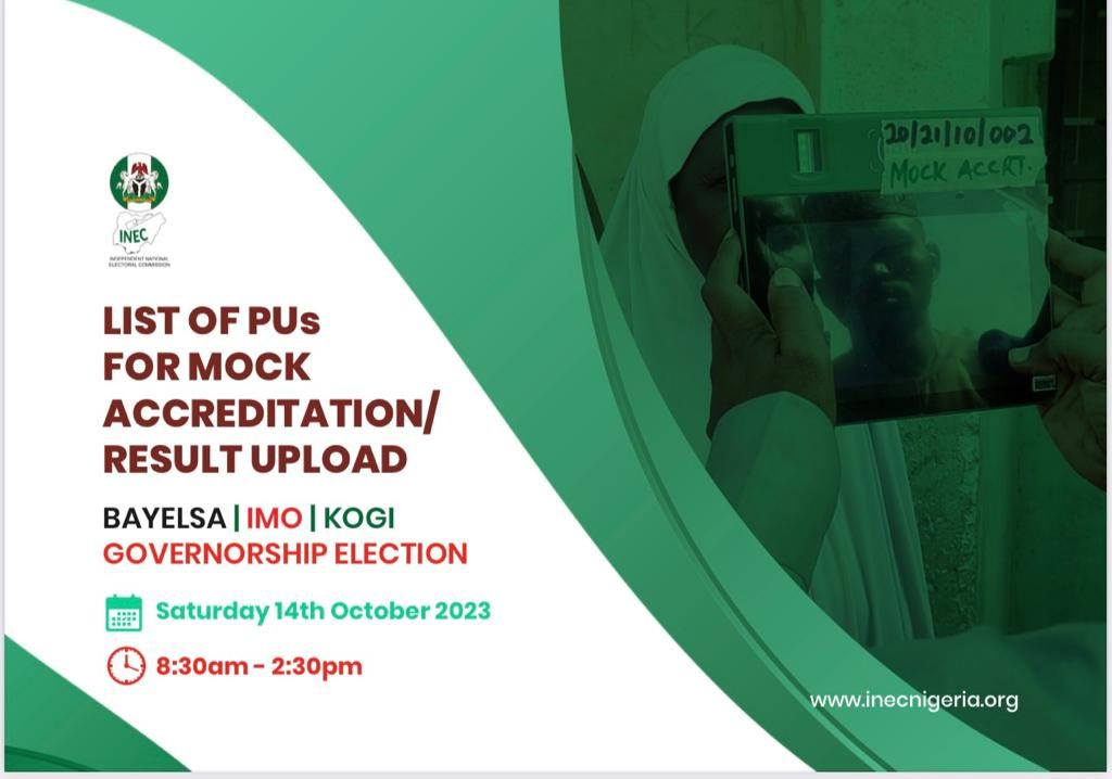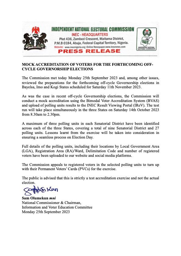 Submission of all applications and documents for accreditation for the three Governorship Elections will end at 12:00 am (Midnight) of Sunday, 22nd October 2023.