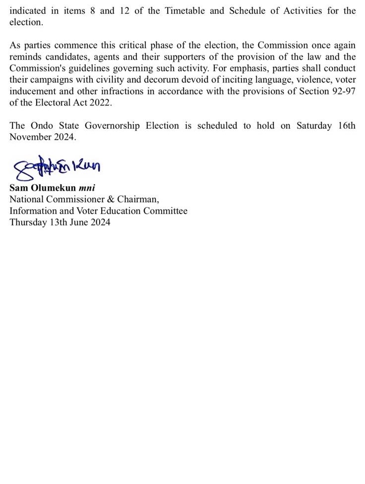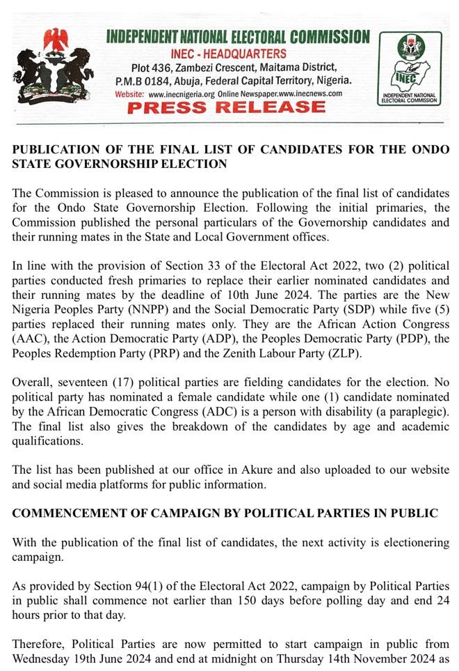 FINAL LIST OF CANDIDATES FOR THE ONDO STATE GOVERNORSHIP ELECTION/COMMENCEMENT OF CAMPAIGN BY POLITICAL PARTIES IN PUBLIC