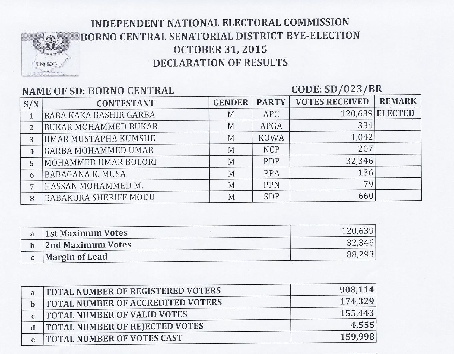 Borno Central Senatorial Election Result Click here to Download Borno Central Senatorial Election Result