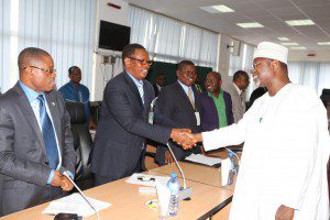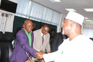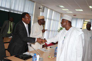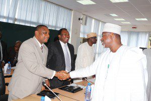 INEC, Prof. Attahiru M. Jega in a handshake with National Commissioner and a member of TCCD, Dr. Chris O. Iyimoga