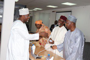 Chairman of INEC Prof. Attahiru M. Jega OFR, exchanging pleasantry with National Commissioners, Dr. Abdulkadir Oniyangi, Amb. Ahmed Wali and Hajia Amina Zakari