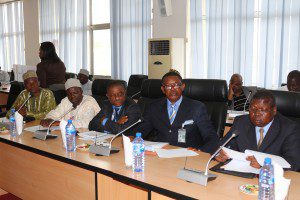 INEC Chairman, Prof. Attahiru M. Jega (Middle), Chairman of the TCCD, Engr. Dr. Nuru Yakubu, OON (5th from left), some National Commissioners, some RECs who are members of the Committee and other members of TCCD.