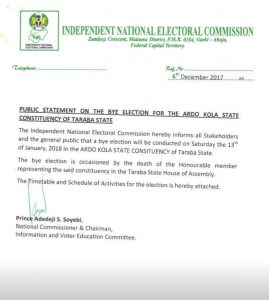 Public Statement on The Bye Election For The Ardo Kola State Constituency of Taraba State