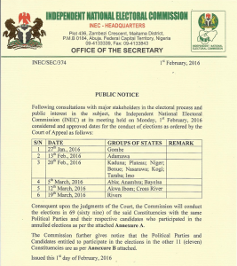The Commission at its meeting on Monday, 1st February, 2016 considered and approved dates for the conduct of elections as ordered by the Court of Appeal