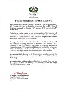 1. About thirteen hours ago, I conveyed to Nigerians the decision of the Independent National Electoral Commission (INEC) to reschedule the 2019 general elections by one week. Presidential and National Assembly earlier scheduled for 16th February 2019 will now hold on Saturday 23rd February 2019 while Governorship, State Assembly and FCT Area Council elections scheduled for 2nd March 2019 will now hold on Saturday 9th March 2019. The one-week adjustment was a painful one for INEC but necessary in the overall interest of our democracy.
