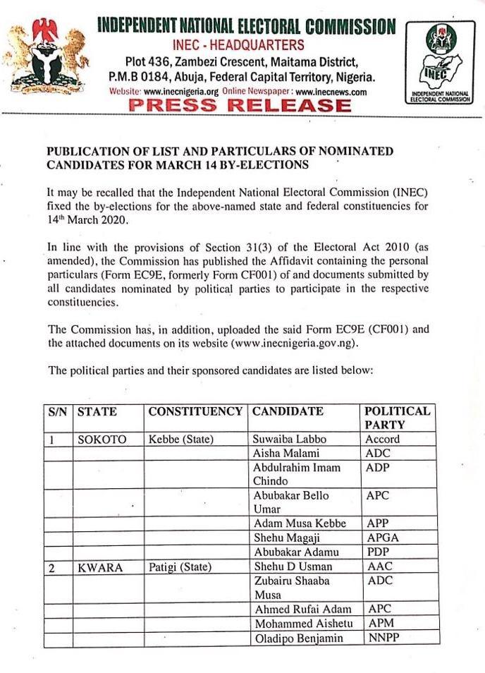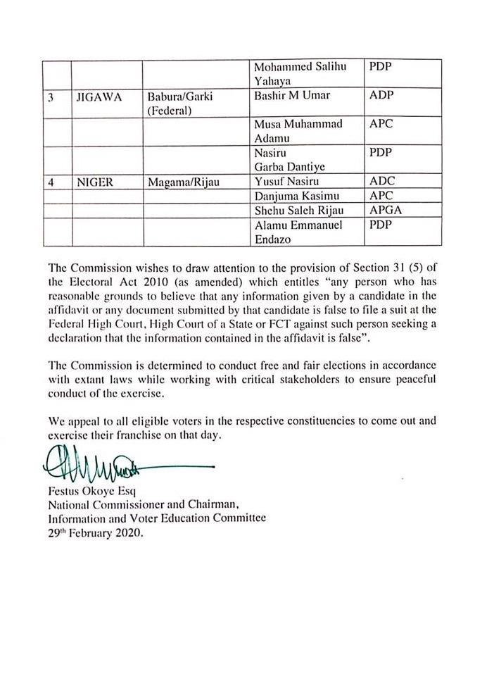 publication of the final list of candidates for bayelsa, imo and kogi states governorship elections