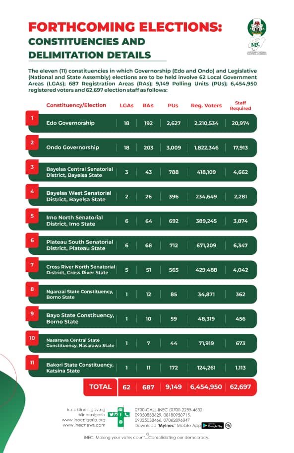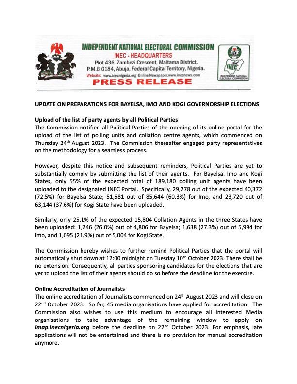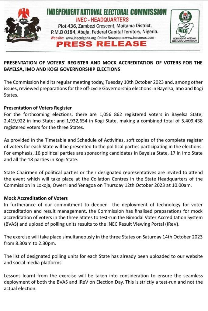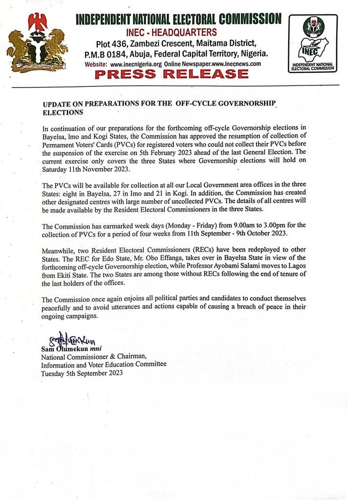 at its regular meeting held today tuesday 6th june 2023, the commission approved the final list of candidates for the three off-cycle governorship elections scheduled to hold in bayelsa, imo and kogi states on saturday 11th november 2023.
