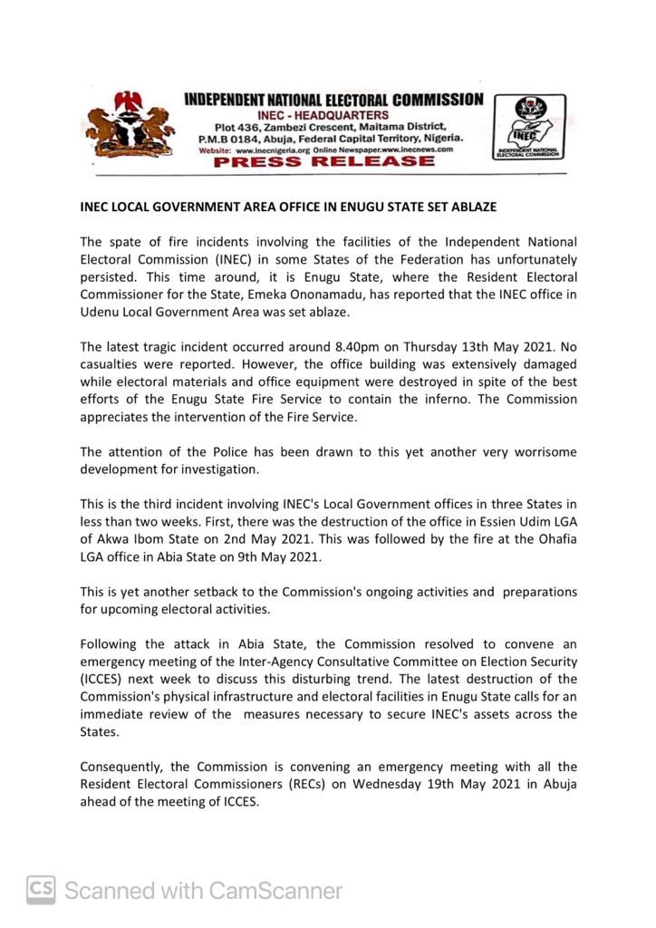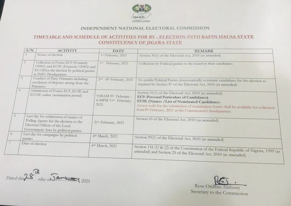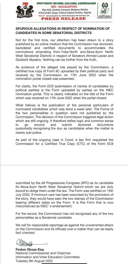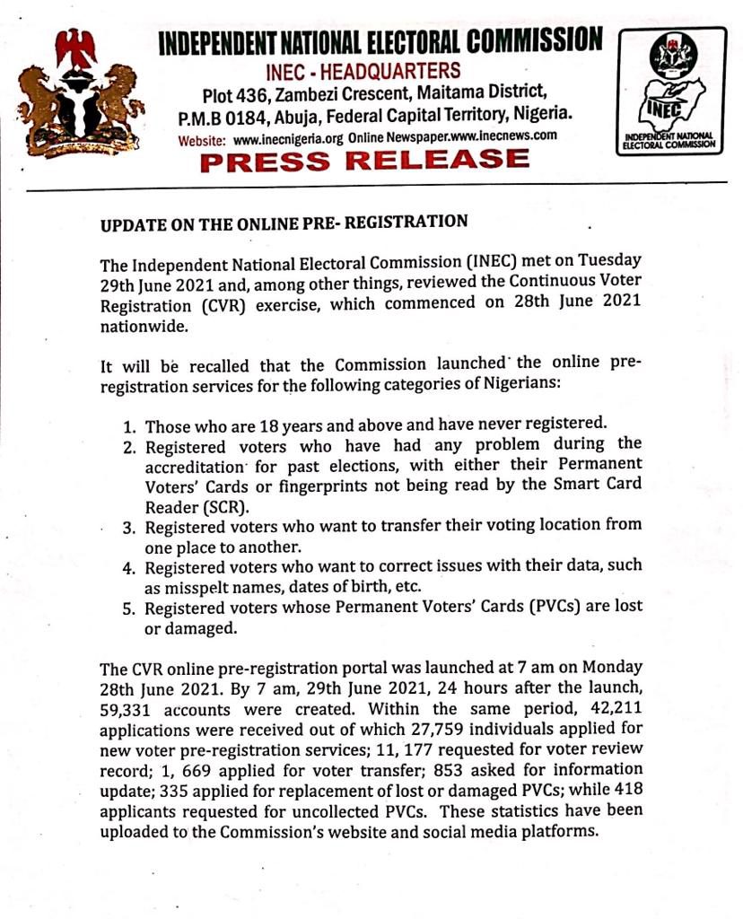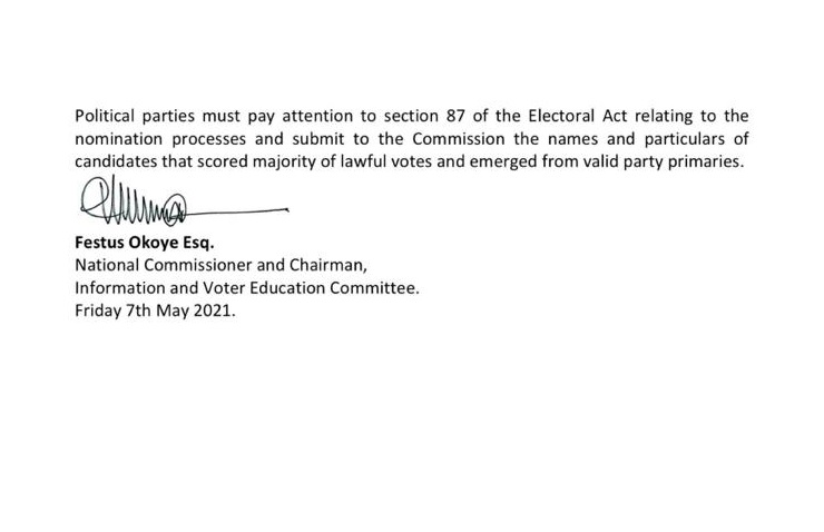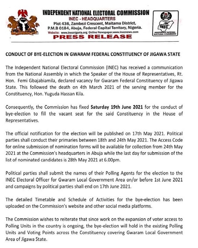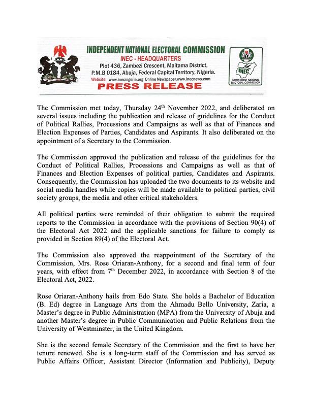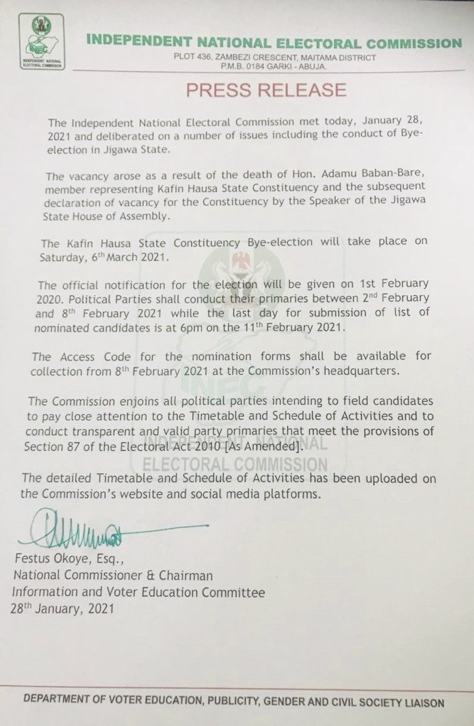 ISSUED BY: Rotimi Lawrence Oyekanmi, Chief Press Secretary to Hon Chairman, Independent National Electoral Commission, Plot 436 Zambezi Crescent, Maitama, Abuja, Federal Capital Territory. Cell: +234 803 791 2525 Twitter: @rot1930 URL: www.inecnews.com