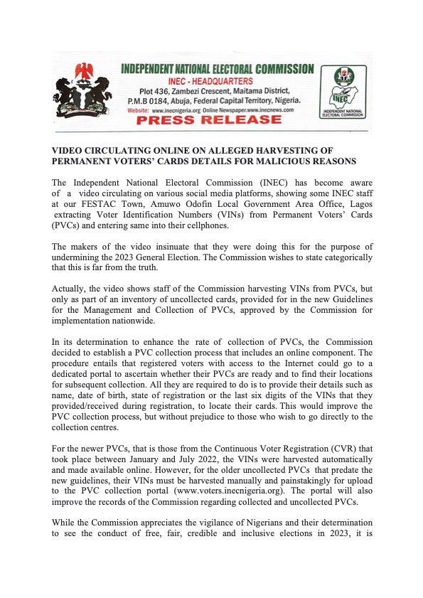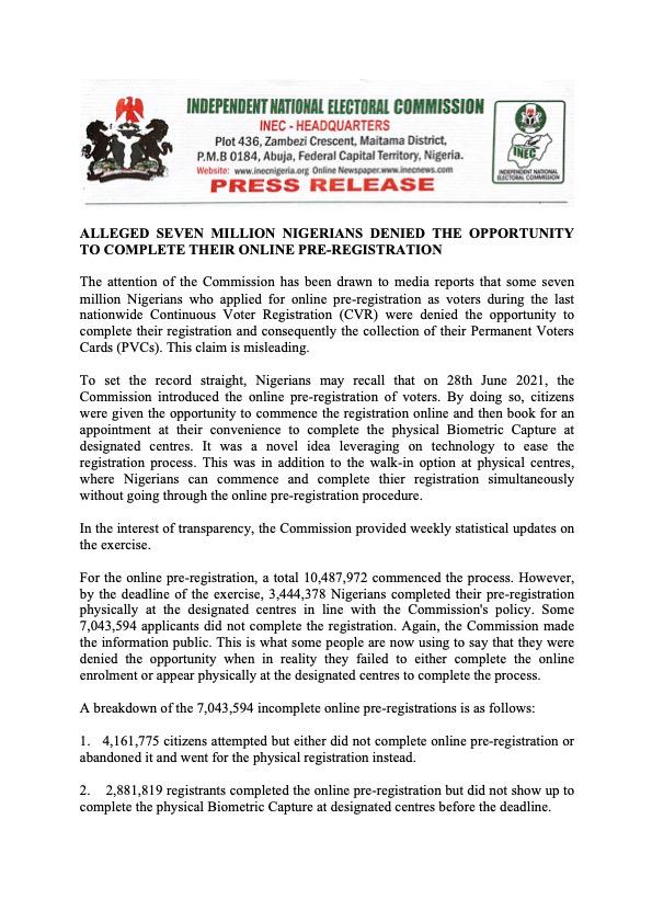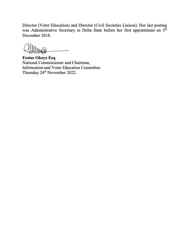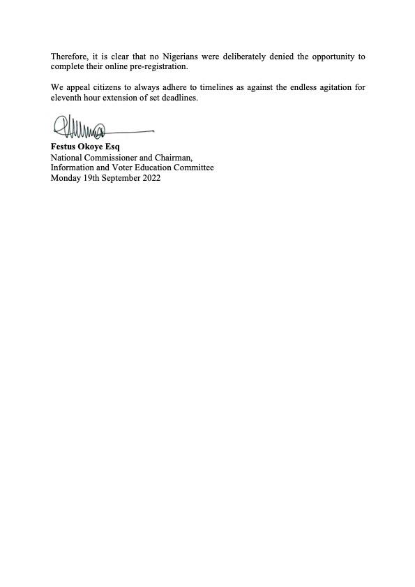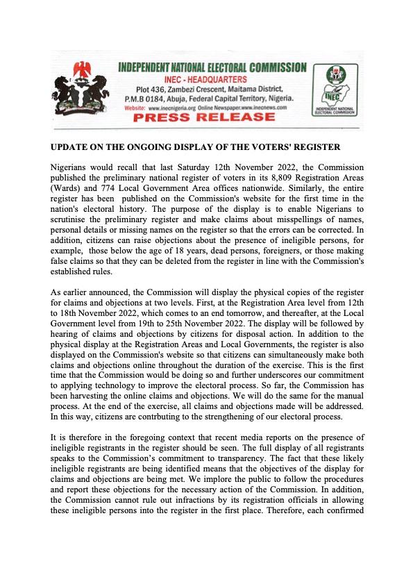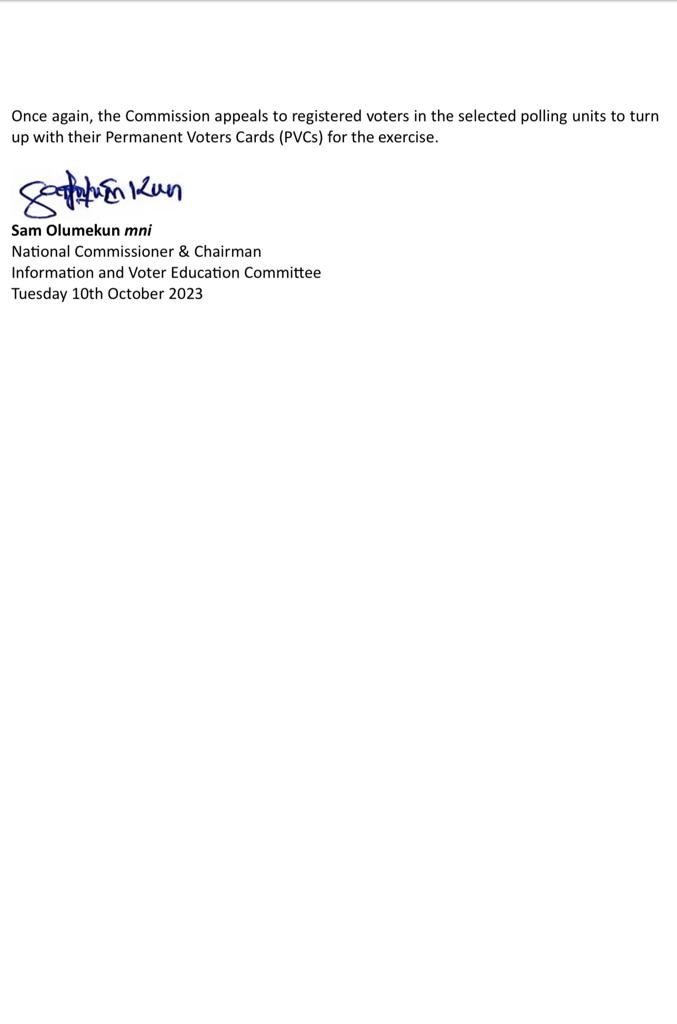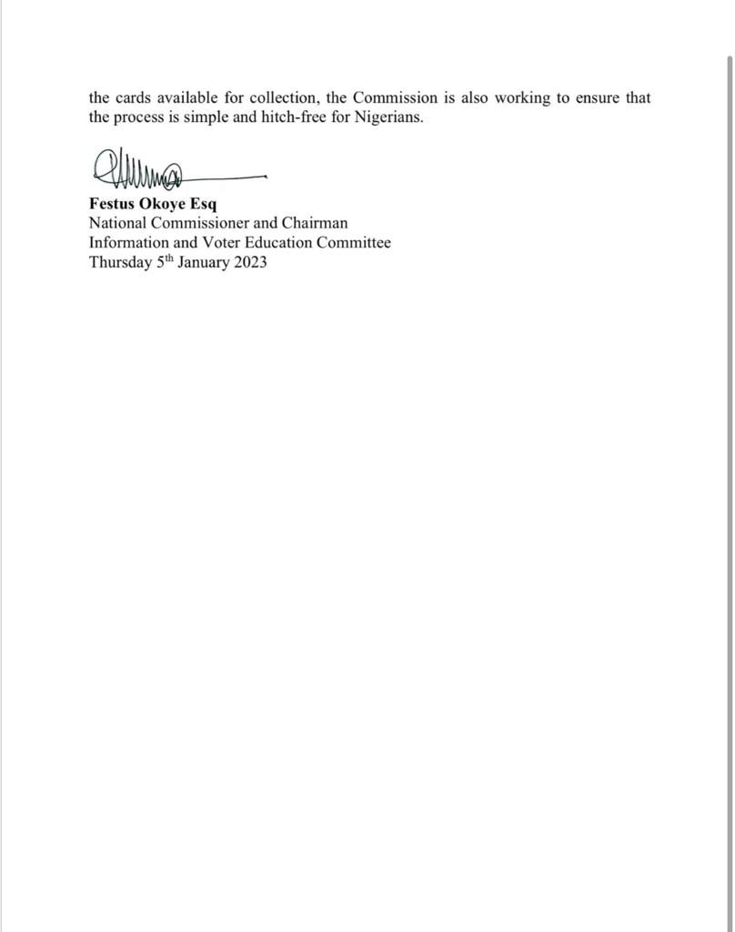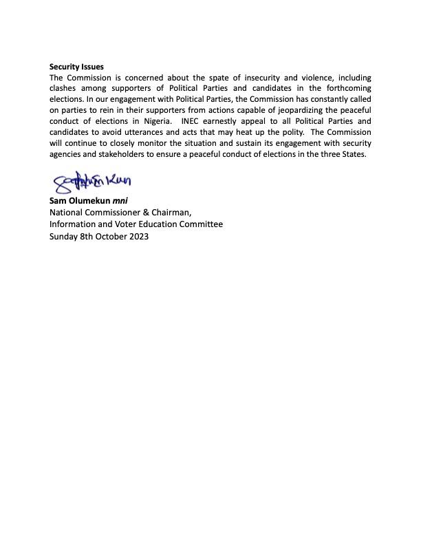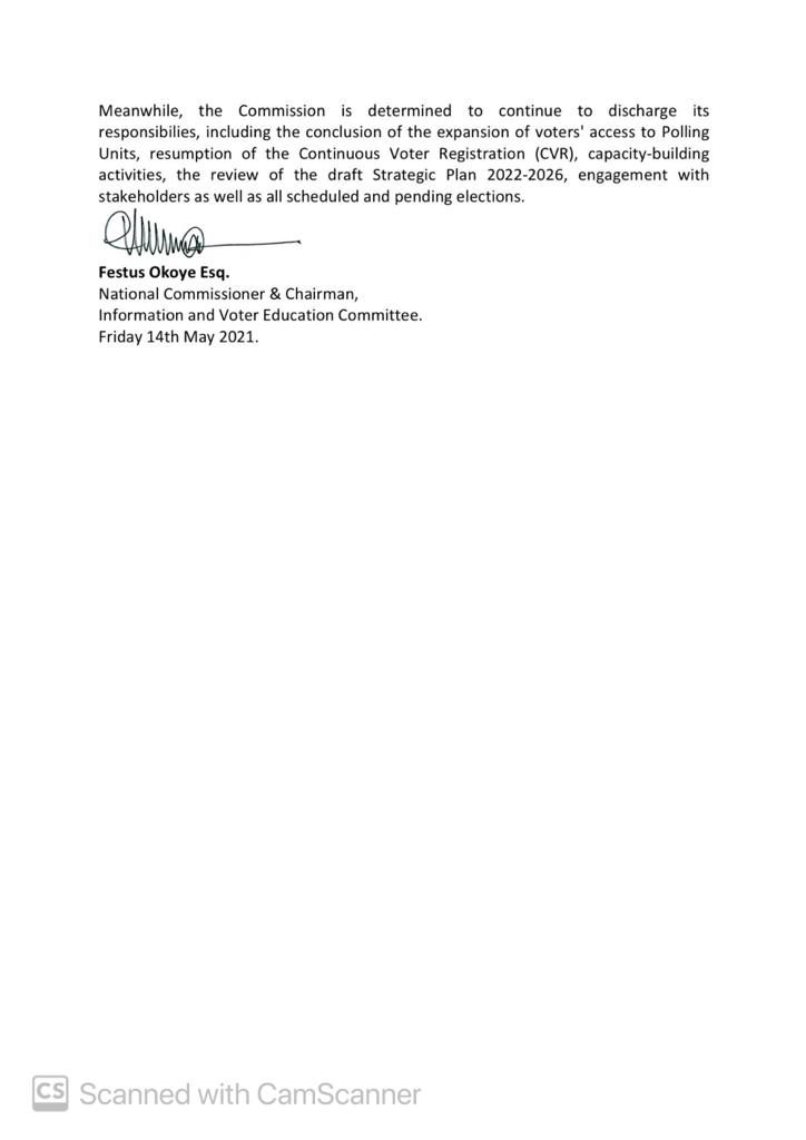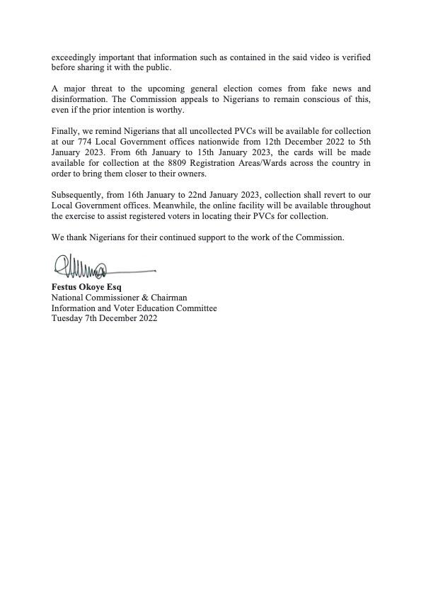 1. I want to appeal to Nigerians and all other stakeholders for their understanding in what has been a very difficult decision for the Commission. But we believe that ultimately this is for the good of our democracy and country. I wish to assure you of our commitment to free, fair and credible elections.