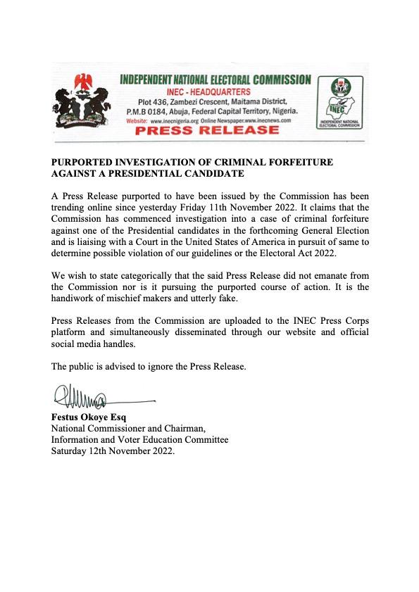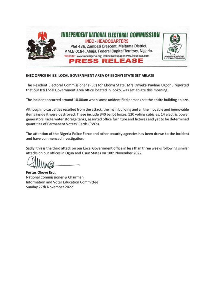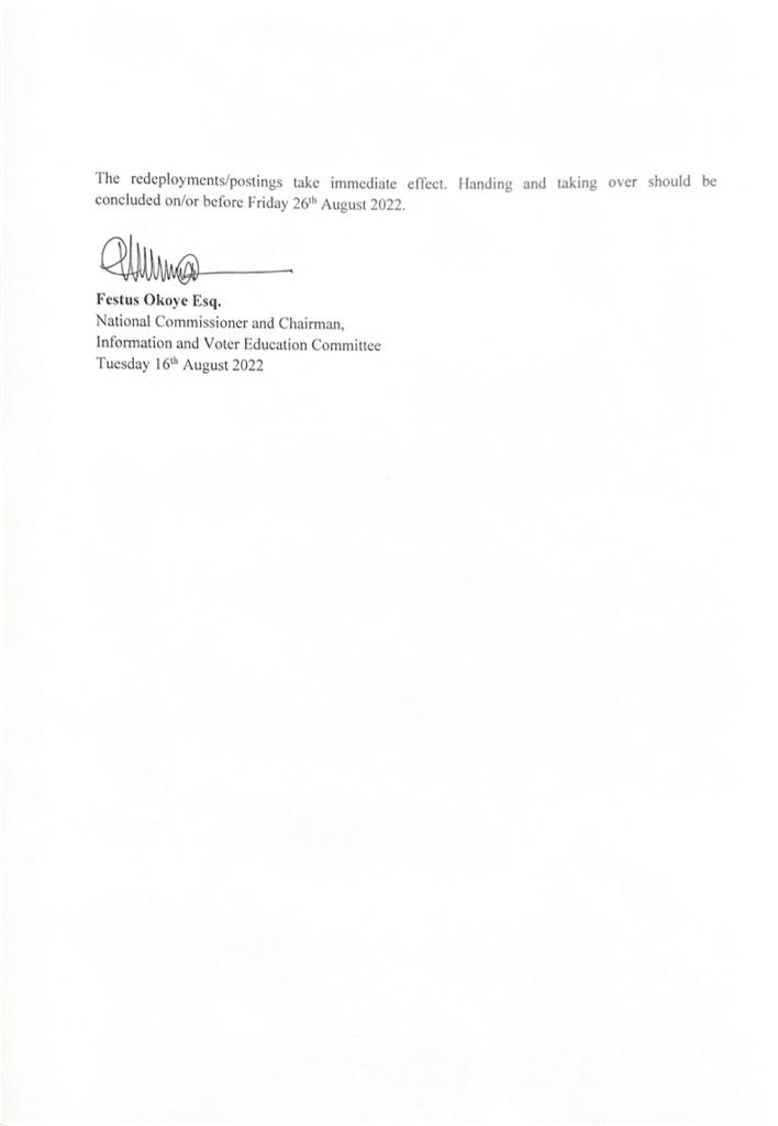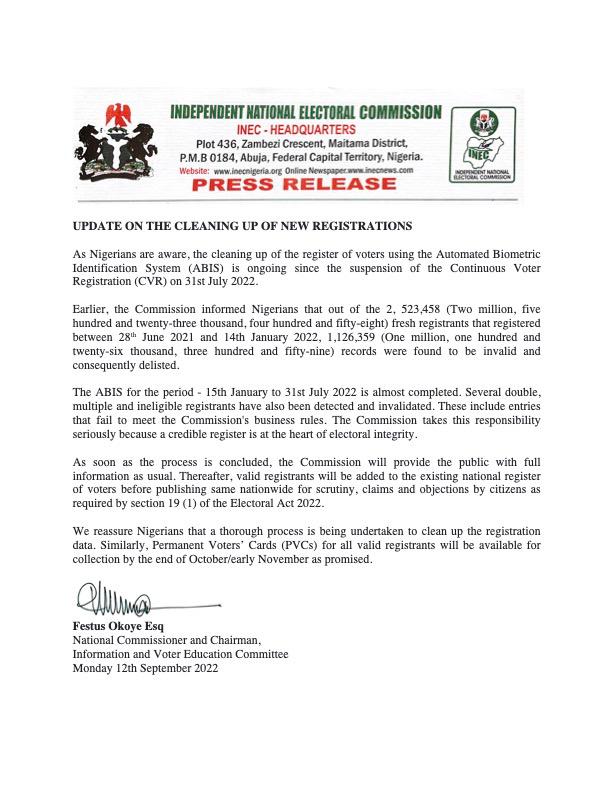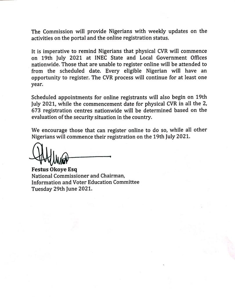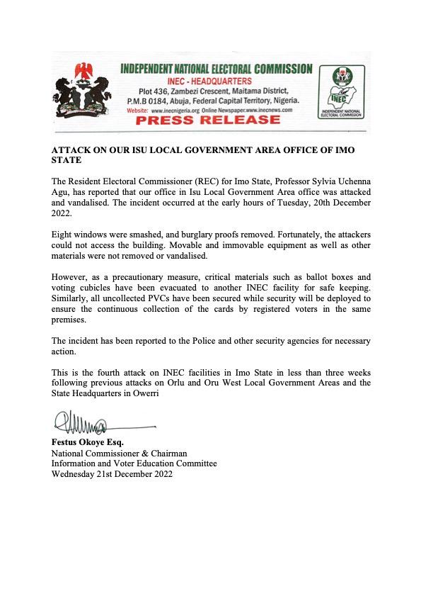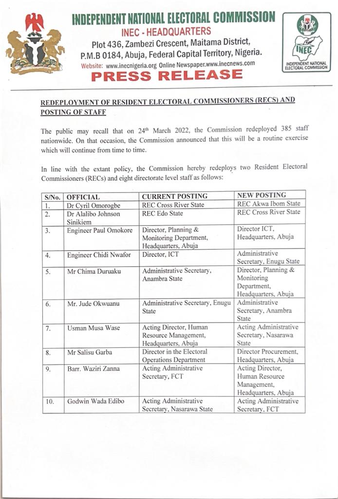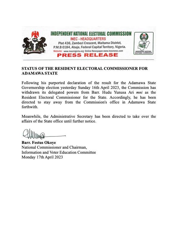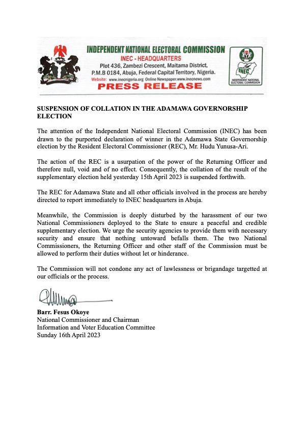 1. I want to appeal to Nigerians and all other stakeholders for their understanding in what has been a very difficult decision for the Commission. But we believe that ultimately this is for the good of our democracy and country. I wish to assure you of our commitment to free, fair and credible elections.