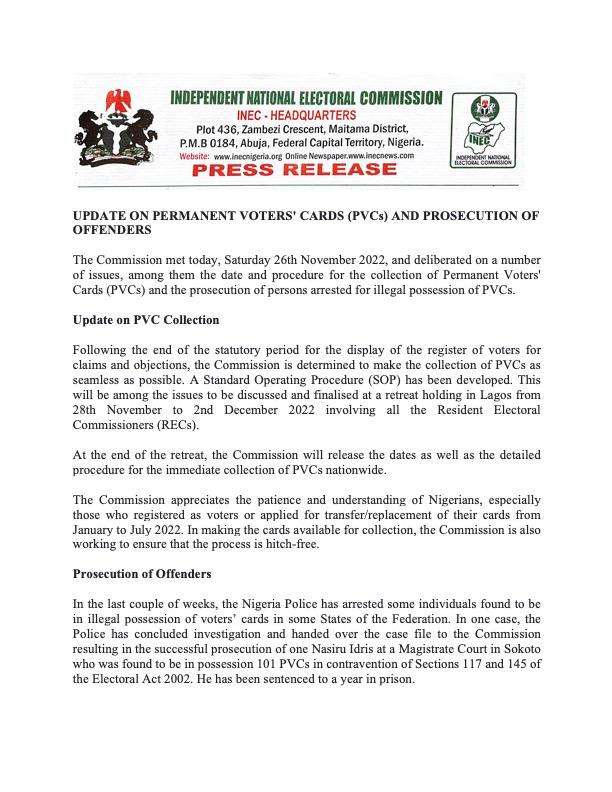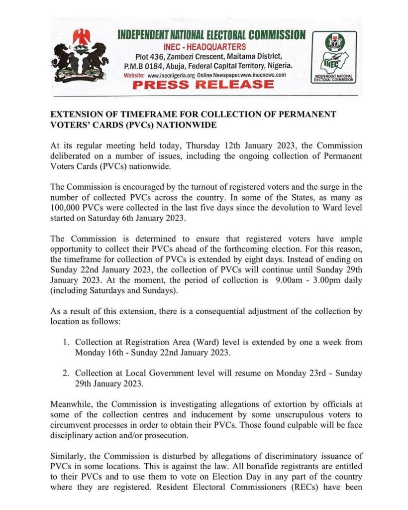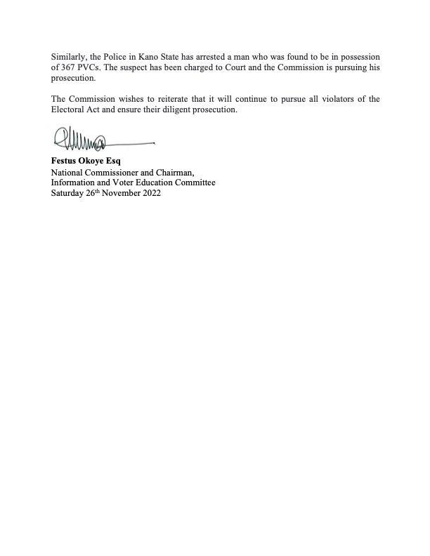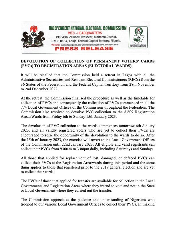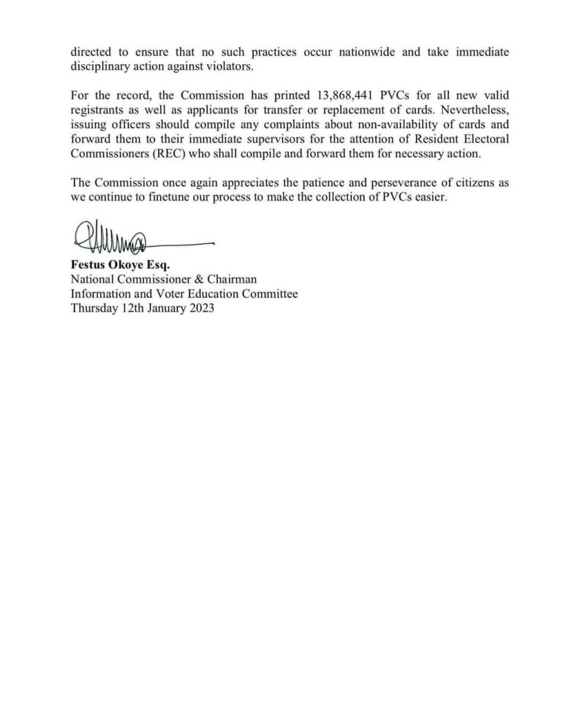 4. The Commission wishes to reassure Nigerians that we will continue to take every necessary step to ensure that no registered voter is disenfranchised on account of non-collection of PVCs. Similarly, the Commission is taking urgent steps to address complaints of unavailability of the PVCs of some registered voters before the end the deadline for the collection.