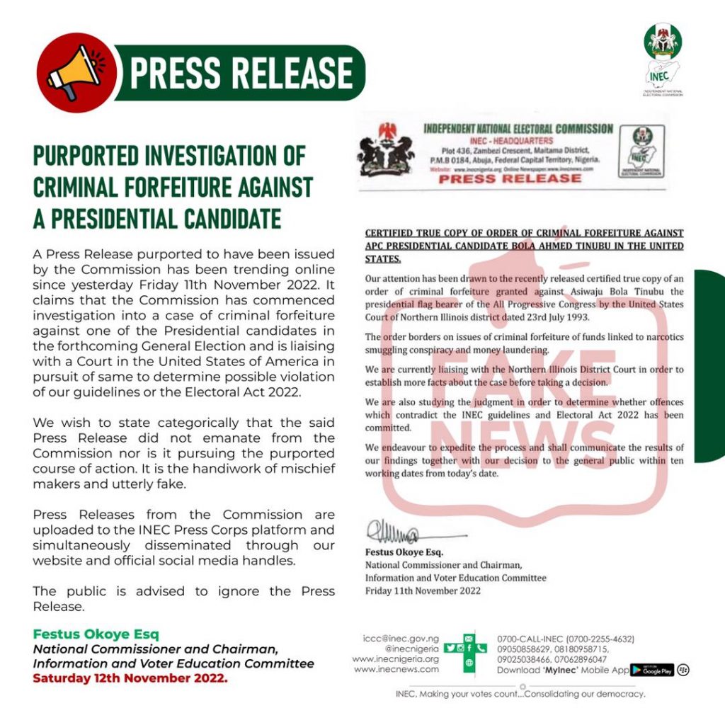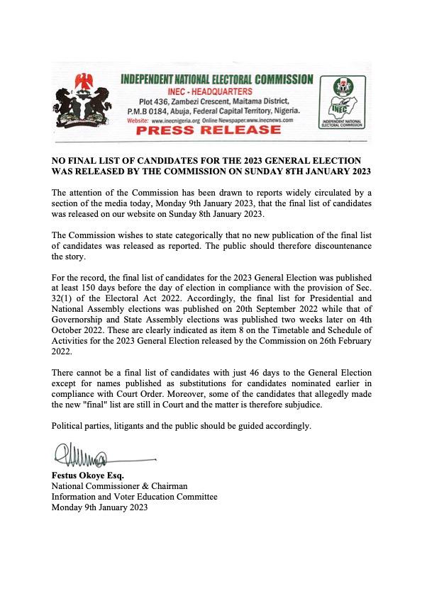 the decision is in line with the provision of section 32(1) of the electoral act 2022 which requires the publication of the list not later than 150 days to election day i.e. friday 9th june 2023 following the period for voluntary withdrawal and substitution of candidates by political parties under section 31 of the electoral act 2022.